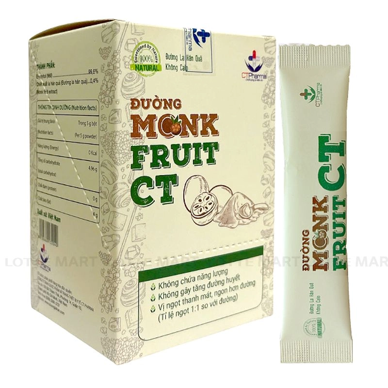 - Đường Ăn Kiêng Monk Fruit CT là sản phẩm 100% tự nhiên, chiết xuất từ la hán quả, mang đến vị ngọt thanh nhẹ mà không có hậu vị đắng, là lựa chọn hoàn hảo cho những ai đang ăn kiêng hoặc cần kiểm soát lượng đường, đặc biệt an toàn cho người tiểu đường.
