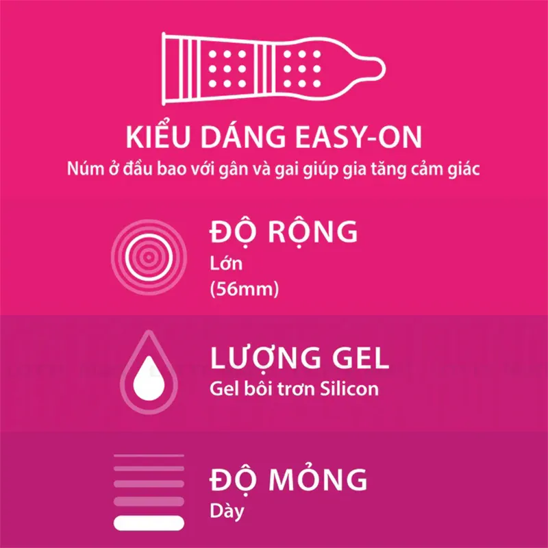 Sản phẩm được sản xuất hoàn toàn bằng chất liệu mủ cao su thiên nhiên, đường kính 56mm đáp ứng những yêu cầu và điều kiện sản xuất khắt khe dành cho sản phẩm nhạy cảm.