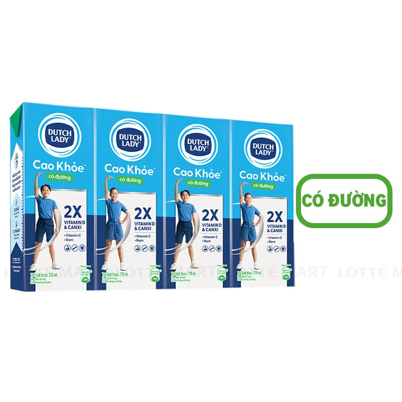 Sữa tiệt trùng Dutch Lady cao khỏe được bổ sung gấp đôi viatamin D dành riêng cho trẻ em Việt Nam, giúp đẩy mạnh hấp thu canxi để trẻ phát triển chiều cao và khỏe mạnh.