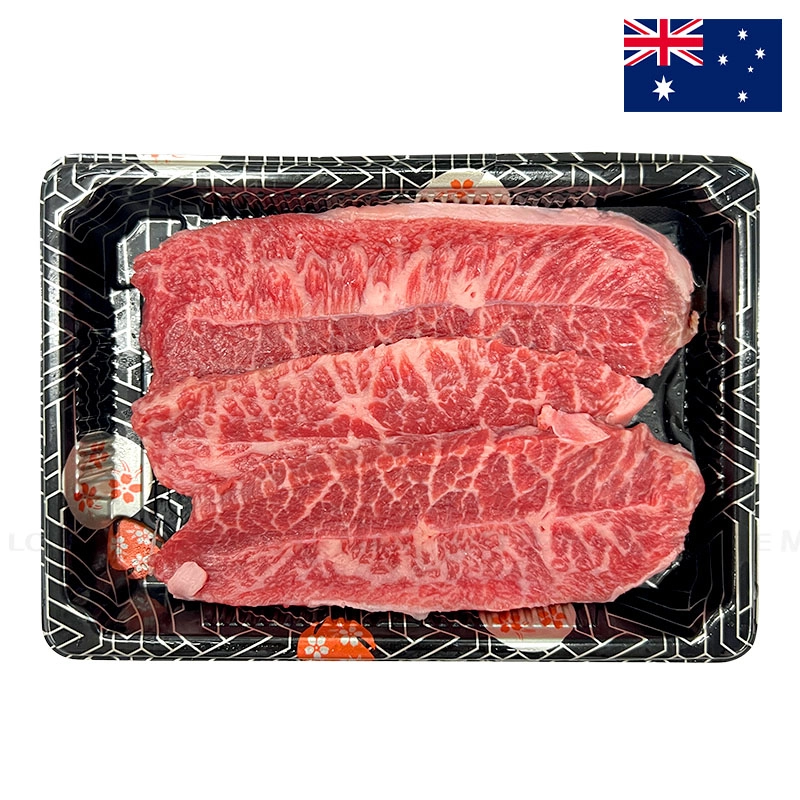 Lõi Nạc Vai Bò Úc Cắt Lát Cho Món Lẩu là phần thịt nằm ở vai con bò, nổi bật với một đường gân nhỏ chạy giữa miếng thịt và các đường vân mỡ cẩm thạch (marbling) đan xen.