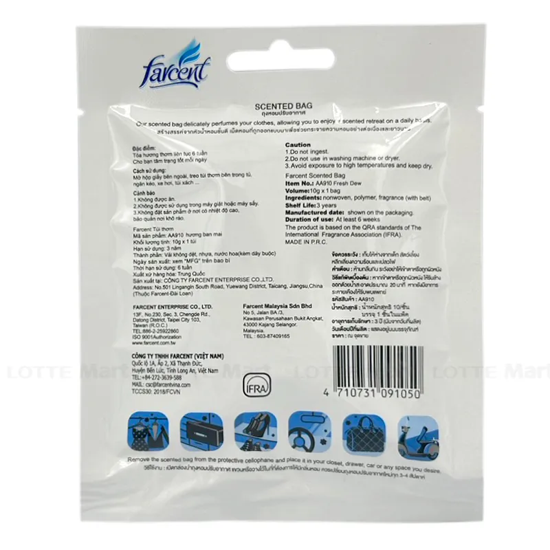 Túi Thơm Farcent với thành phần đặc biệt, giúp tạo hương thơm tinh tế cho quần áo. Hương thơm dễ chịu, bắt đầu cho ngày mới tràn đầy năng lượng Với túi thơm này, bạn có thể sử dụng đến 06 tuần. Trọng lượng nhẹ, bao bì bắt mắt tiện lợi khi sử dụng.