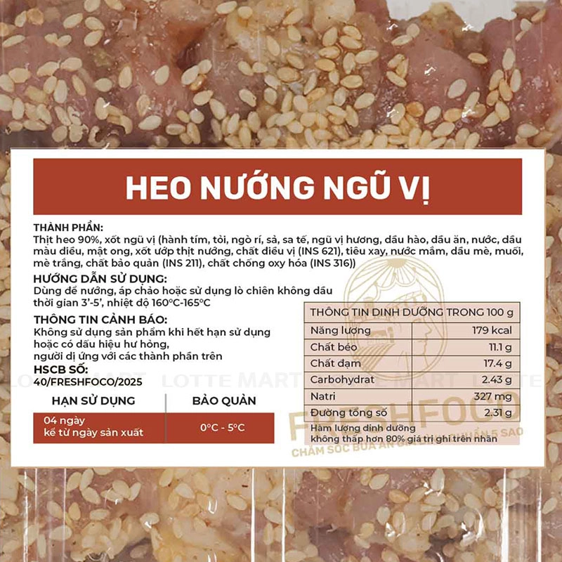 - Thịt heo 90%, xốt ngũ vị (hành tím, tỏi, ngò rí, sả, sa tế, ngũ vị hương, dầu hào, dầu ăn, nước, dầu màu điều, mật ong, xốt ướp thịt nướng, chất điều vị (INS 621), tiêu xay, nước mắm, dầu mè, muối, mè trắng, chất bảo quản (INS 211), chất chống oxy hóa (INS 316))