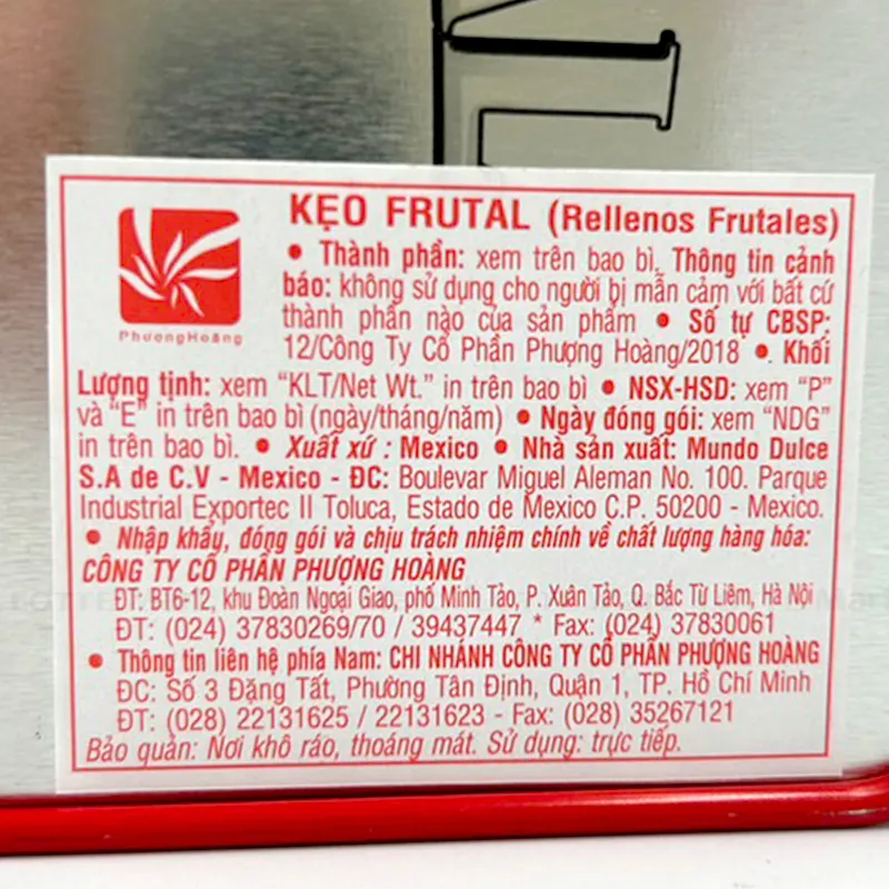 - Kẹo Rellenos Frutales Hộp Thiếc 250G với những viên kẹo có màu sắc rực rỡ và các hương vị trái cây thơm ngon, là món ăn vặt hấp dẫn tất cả mọi người. Kẹo được làm từ các thành phần chính như: đường, tinh dầu hoa quả tươi, sữa nguyên kem … mang đến cho người thưởng thức hương vị ngọt ngào, tươi mới.