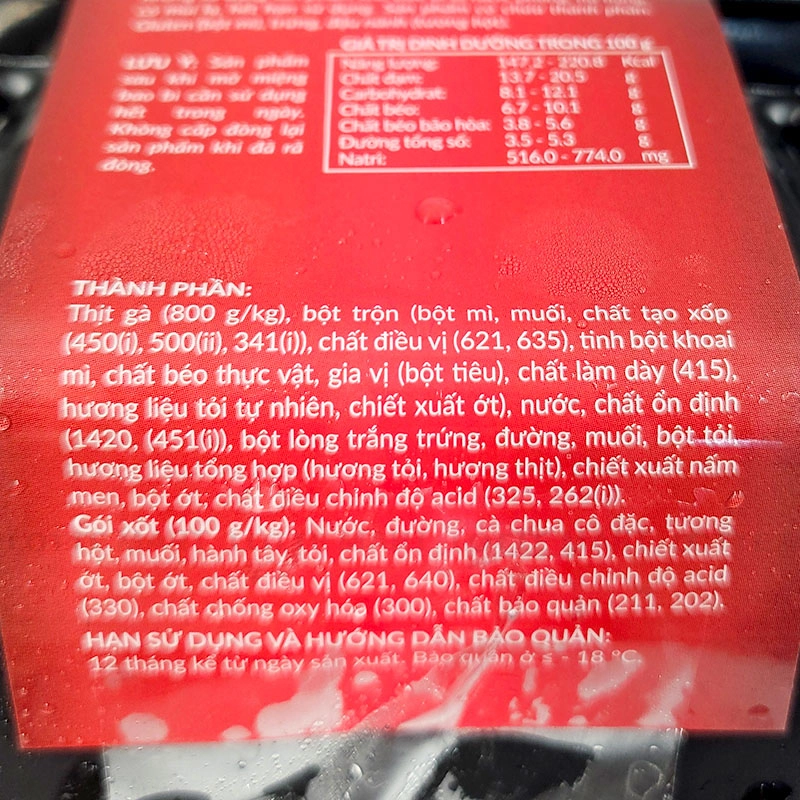 - Thịt gà (800g/kg), bột trộn (bột mì, muối, chất tạo xốp (450(i), 500(ii), 341(i)), chất điều vị (621, 635), tinh bột khoai mì, chất béo thực vật, gia vị (bột tiêu), chất làm dày (415), hương liệu tỏi tự nhiên, chiết xuất ớt), nước, chất ổn định (1420, (451(i)), bột lòng trắng trứng, đường, muối, bột tỏi, hương liệu tổng hợp (hương tỏi, hương thịt), chiết xuất nấm men, bột ớt, chất điều chỉnh độ acid (325, 262(i)).