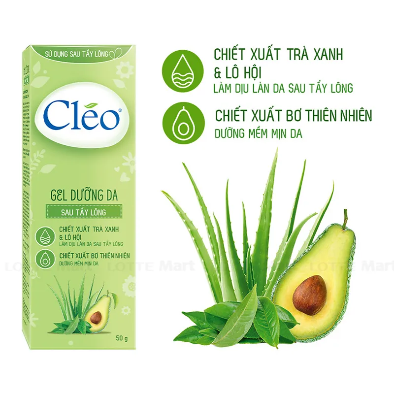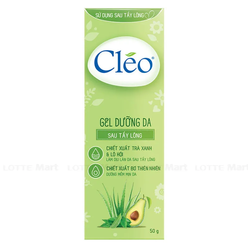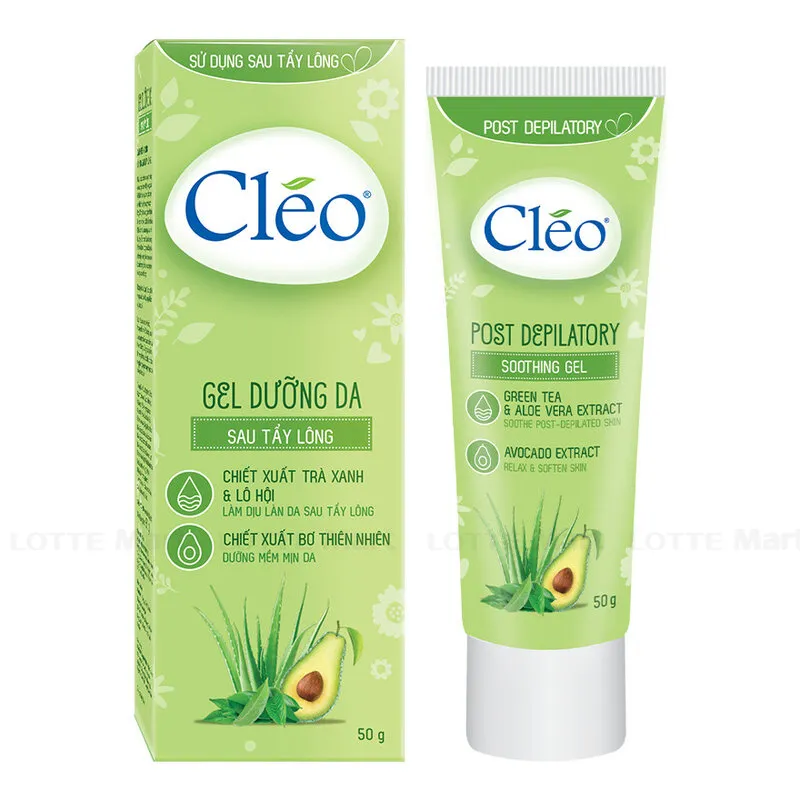 Gel Dưỡng Da Sau Tẩy Lông Cléo Dưỡng Ẩm Và Dịu Da Tuýp 50g là sản phẩm gel dưỡng ẩm da chuyên biệt sử dụng cho sau khi tẩy lông cơ thể đến từ thương hiệu Cleo của Việt Nam, chứa các thành phần tự nhiên như trà xanh, lô hội và bơ giúp làm dịu tức thì, giảm tình trạng kích ứng, mẩn đỏ đồng thời dưỡng ẩm và làm mềm mịn vùng da sau khi tẩy lông. Sản phẩm sử dụng được cho tất cả vùng tẩy lông trên cơ thể, nếu bạn thường xuyên tẩy lông thì đây là sản phẩm kèm thêm không thể bỏ qua. Đặc biệt sản phẩm còn có hương thơm dễ chịu để lại mùi hương tự nhiên trên cơ thể bạn.