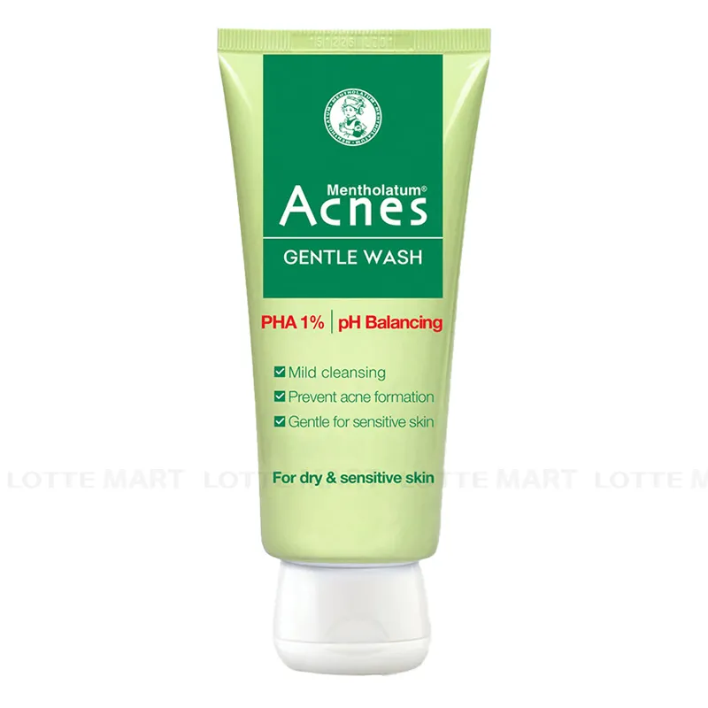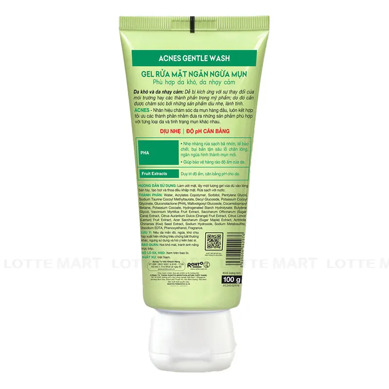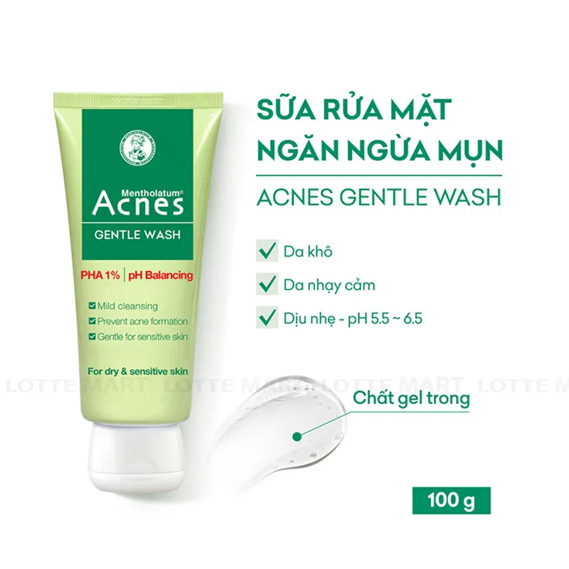 - Gel Rửa Mặt Acnes Gentle Wash Ngăn Ngừa Mụn 100g với kết cấu gel trong suốt, độ pH cân bằng phù hợp riêng cho làn da khô, nhạy cảm. Sản phẩm nổi bật với thành phần PHA và chiết xuất từ thiên nhiên giúp làm sạch sâu lỗ chân lông, ngăn ngừa, giảm tình trạng mụn đồng thời cung cấp độ ẩm, ngăn tình trạng mất nước, khô căng sau khi rửa mặt.