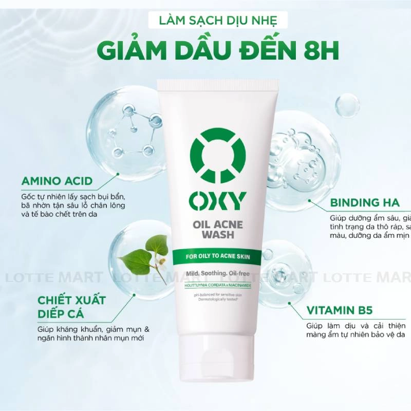 - Gel Rửa Mặt Oxy Cho Da Dầu Mụn với thành phần Amino Acid gốc tự nhiên giúp lấy sạch bụi bẩn, bã nhờn tận sâu lỗ chân lông và tế bào chết trên da. Sản phẩm có khả năng tạo bọt nhẹ, giúp làm sạch dịu nhẹ, giảm dầu và dịu da trong 8 giờ.