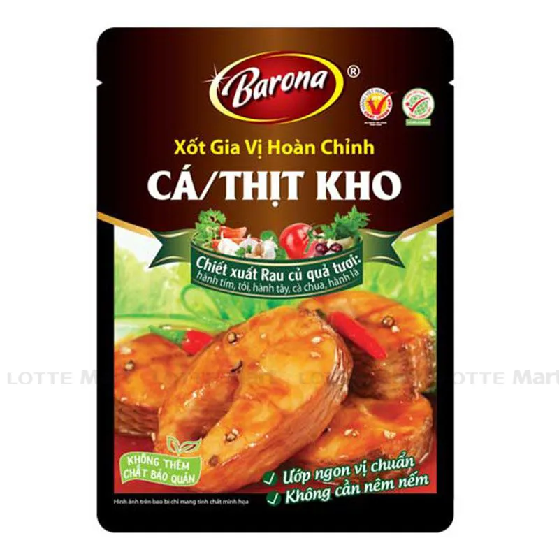 Với sốt gia vị kho cá/ thịt Barona, sẽ làm cho món cá/thịt kho vị trở nên đậm đà, thơm ngon hấp dẫn đến miếng cuối cùng, kích thích vị giác của người dùng. Thành phần: Chất chiết từ rau củ quả tươi 53,6% (Tỏi 19,8%, cà chua 16,3%, hành tím 9,9%, hành lá 4,1%, hành tây 3,5%), muối, đường, nước mắm, nước tương, dầu ăn, nước màu dừa, bột bắp, tiêu...Công dụng: Dùng làm gia vị cho các món thịt/ cá kho. Bảo quản ở nơi khô thoáng, tránh ánh nắng trực tiếp.