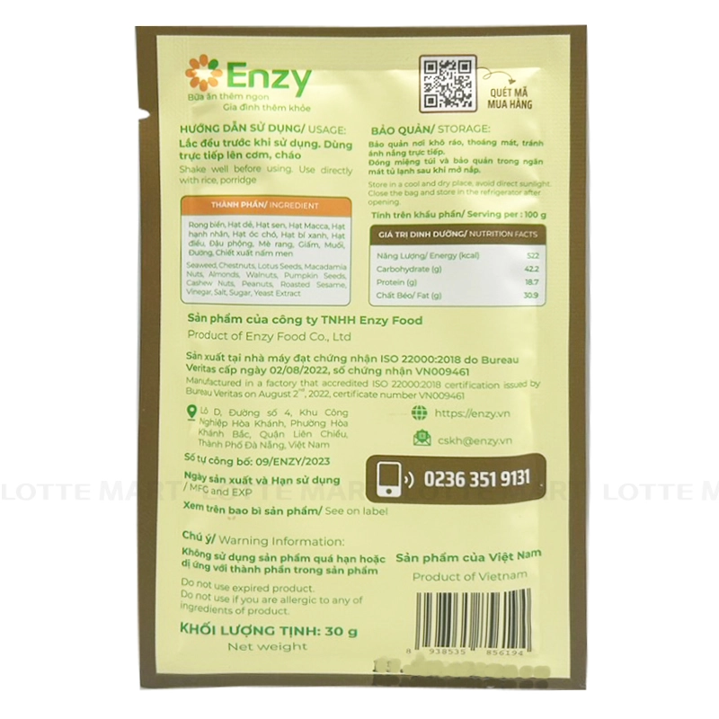 - Gia vị rắc cơm Enzy vị hạt và rong biển là món ăn kèm giúp kích thích vị giác, khuyến khích bé ăn ngon. Thành phần gần 10 loại hạt thơm béo, bùi kết hợp với rong biển và gia vị vừa miệng chắc chắn sẽ khiến bé yêu thích mê. Các thành phần trong gói gia vị đều được bóp vụn thành mảnh nhỏ để bé đang tập ăn dặm cũng có thể thưởng thức mà không sợ hóc nghẹn.