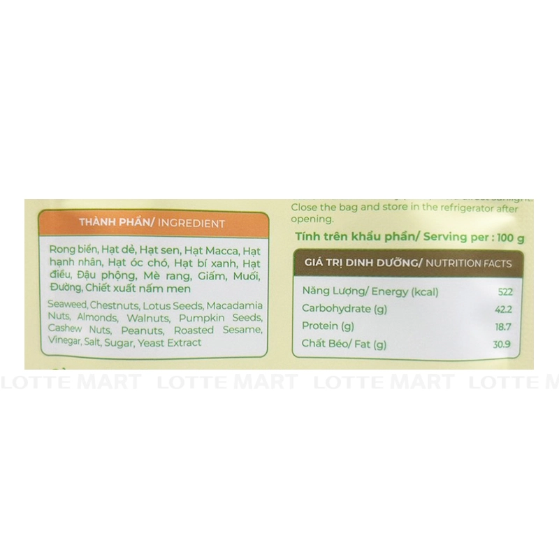 - Hạt dẻ, hạt sen, hạt óc chó, hạt macca, hạt điều, đậu phộng, mè rang, bí xanh, muối, đường, tiêu, chiết xuất nấm men