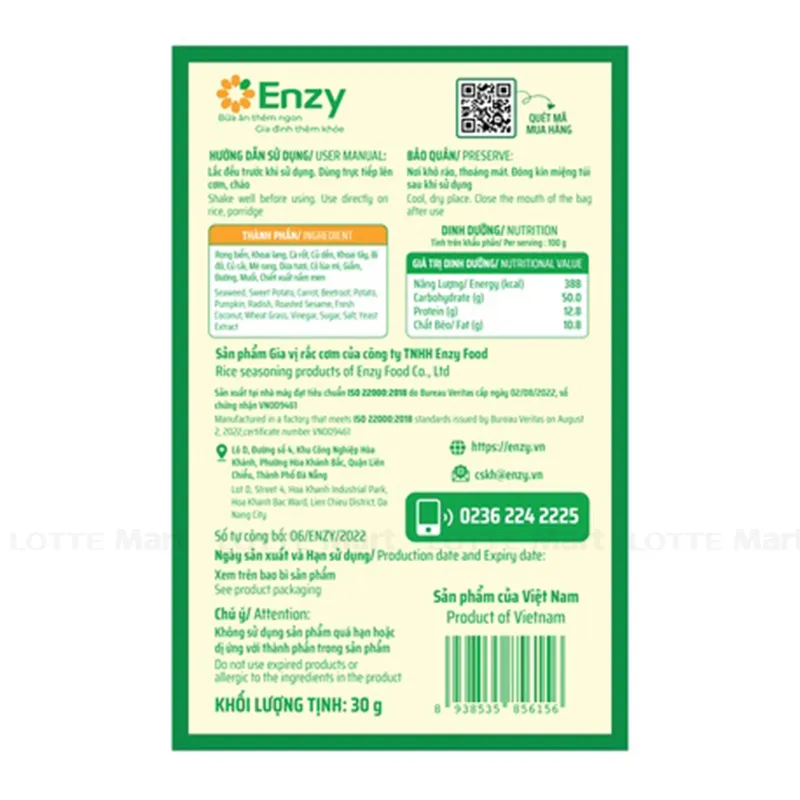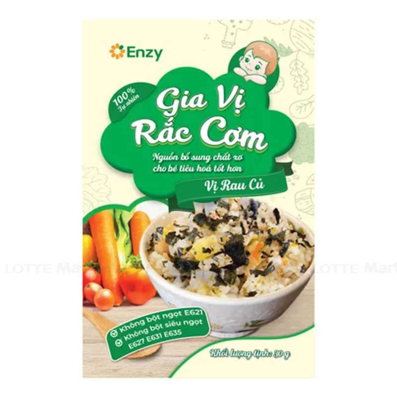 - Gia Vị Rắc Cơm Vị Rau Củ Enzy Gói 30G mang hương vị rau cũ hấp dẫn, được sản xuất trên dây chuyền hiện đại, công nghệ Nhật Bản, không bị tanh của rong biển và sản xuất chuyên dụng để phù hợp với khẩu vị trẻ em Việt Nam.