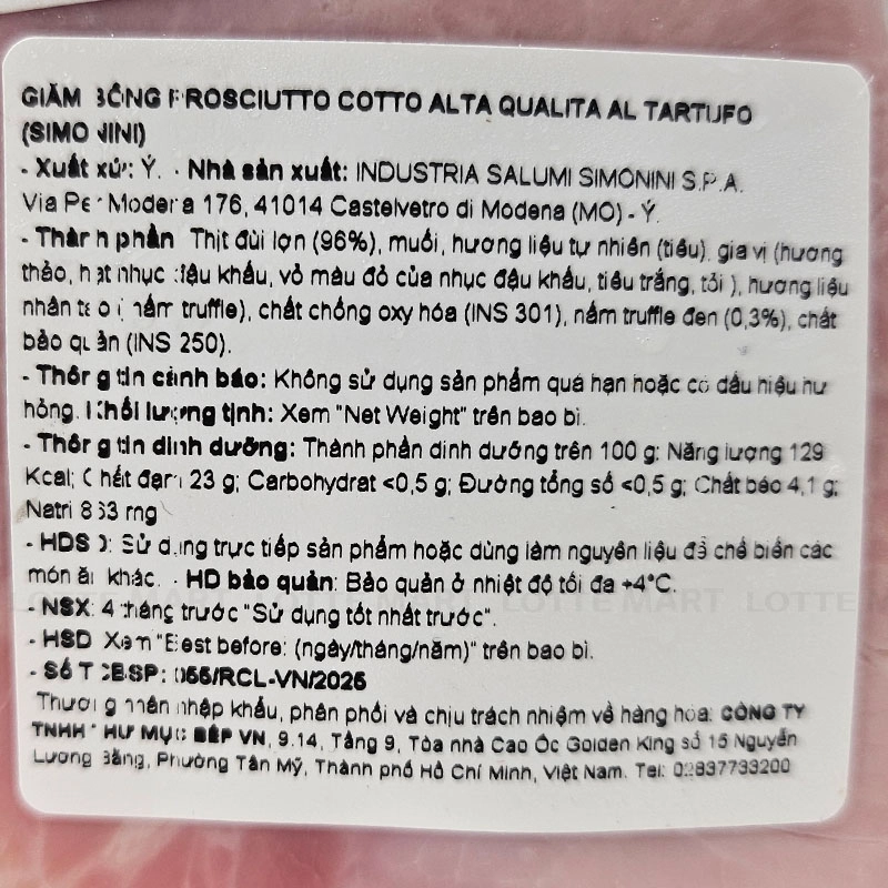 - Giăm Bông Prosciutto Cotto Alta Qualità Al Tartufo Simonini là dòng giăm bông nấu chín cao cấp đến từ Ý, nổi bật với hương vị hài hòa giữa thịt đùi heo tuyển chọn và nấm truffle đen.