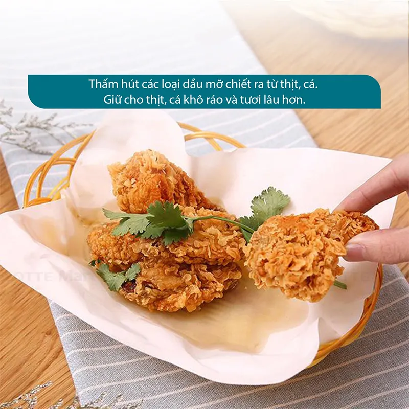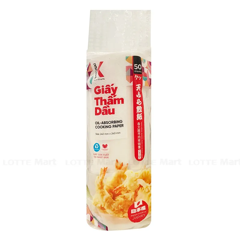 Giấy Thấm Dầu Kokusai 24cm x 24 cm 50 Tờ cao cấp bán chạy tại Nhật Bản, giấy có thể tiếp xúc trực tiếp thực phẩm an toàn tuyệt đối. Có tác dụng thấm hút dầu thừa nhanh chóng, giúp các món chiên, nướng luôn thơm ngon và đảm bảo cho sức khoẻ.. Sản phẩm được sử dụng rộng rãi và thường xuyên trong việc nấu ăn tại Nhật Bản và tại các nước phát triển. Công dụng: Là sản phẩm giấy thấm dầu cao cấp nổi tiếng tại Nhật. Giúp món ăn không bị khô, tóp khi hâm bằng lò vi sóng. Giữ nóng cho thức ăn. Phủ, đậy thức ăn, đảm bảo vệ sinh thực phẩm. Làm khăn lọc các loại dầu mỡ. Thấm hút dầu mỡ thừa từ các món chiên, nướng. Giữ cho thịt cá khô ráo, tươi lâu. Chất liệu: 100% bột giấy kết hợp với chất gắn kết. Kích thước: 24 x 24 cm. Có thể sử dụng được trong tủ lạnh, lò nướng. Sản xuất tại: Việt Nam.
