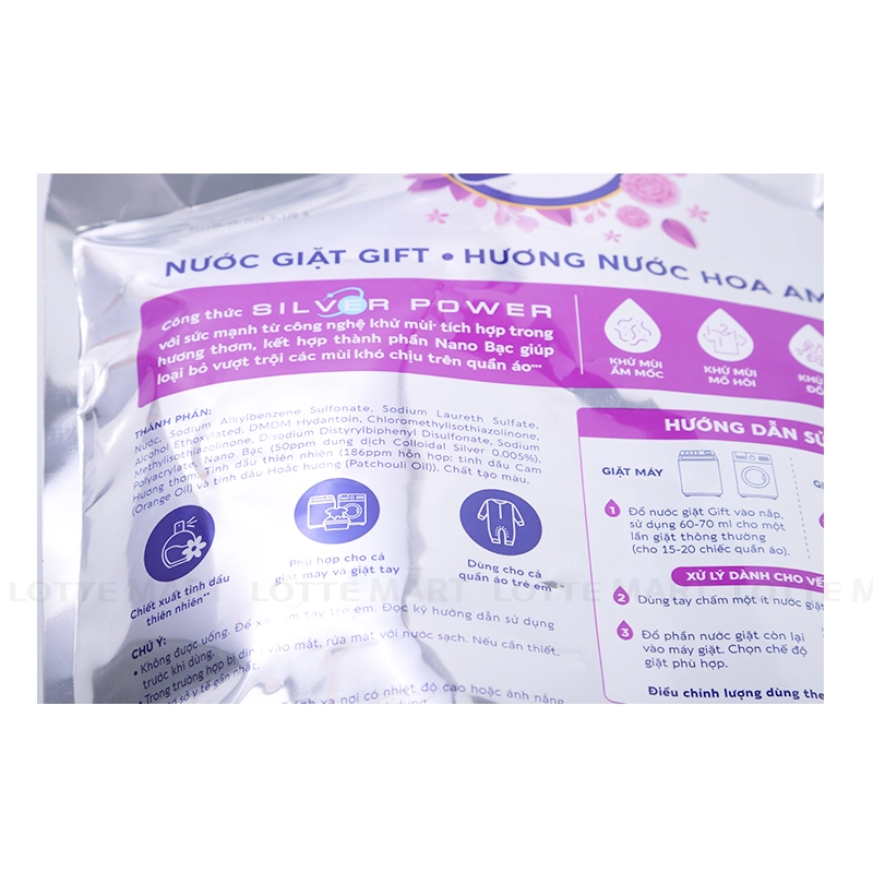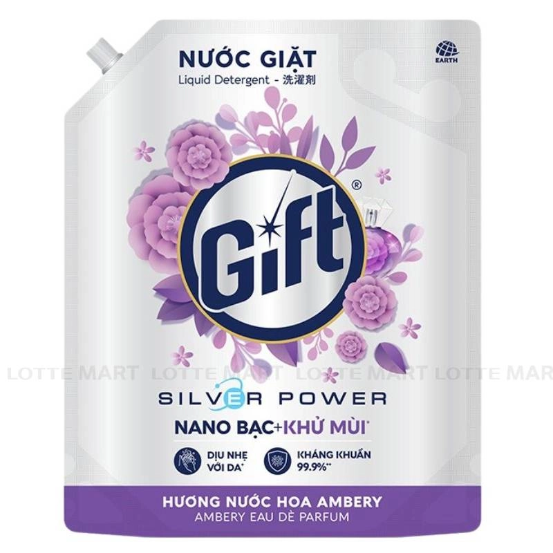 Nước Giặt Gift Hương Nước Hoa Ambery Túi 3.6kg với công thức Silver Power với sức mạnh từ công nghệ khử mùi tích hợp trong hương thơm cùng thành phần Nano Bạc loại bỏ mùi khó chịu trên quần áo: mùi ẩm mốc, mùi mồ hôi, mùi đồ ăn, mùi khói bụi. Diệt 99,9% vi khuẩn C.albicans và Moraxella (Nguyên nhân gốc rễ gây mùi ẩm mốc trên quần áo, mùi hôi khó chịu và khó loại bỏ hiệu quả nhất.).