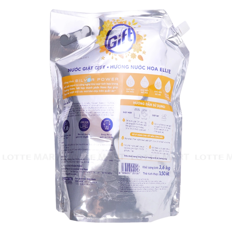 Nước Giặt Gift Hương Nước Hoa Ellie Túi 3.6kg với công thức Silver Power với sức mạnh từ công nghệ khử mùi tích hợp trong hương thơm cùng thành phần Nano Bạc loại bỏ mùi khó chịu trên quần áo: mùi ẩm mốc, mùi mồ hôi, mùi đồ ăn, mùi khói bụi. Diệt 99,9% vi khuẩn C.albicans và Moraxella (Nguyên nhân gốc rễ gây mùi ẩm mốc trên quần áo, mùi hôi khó chịu và khó loại bỏ hiệu quả nhất.).