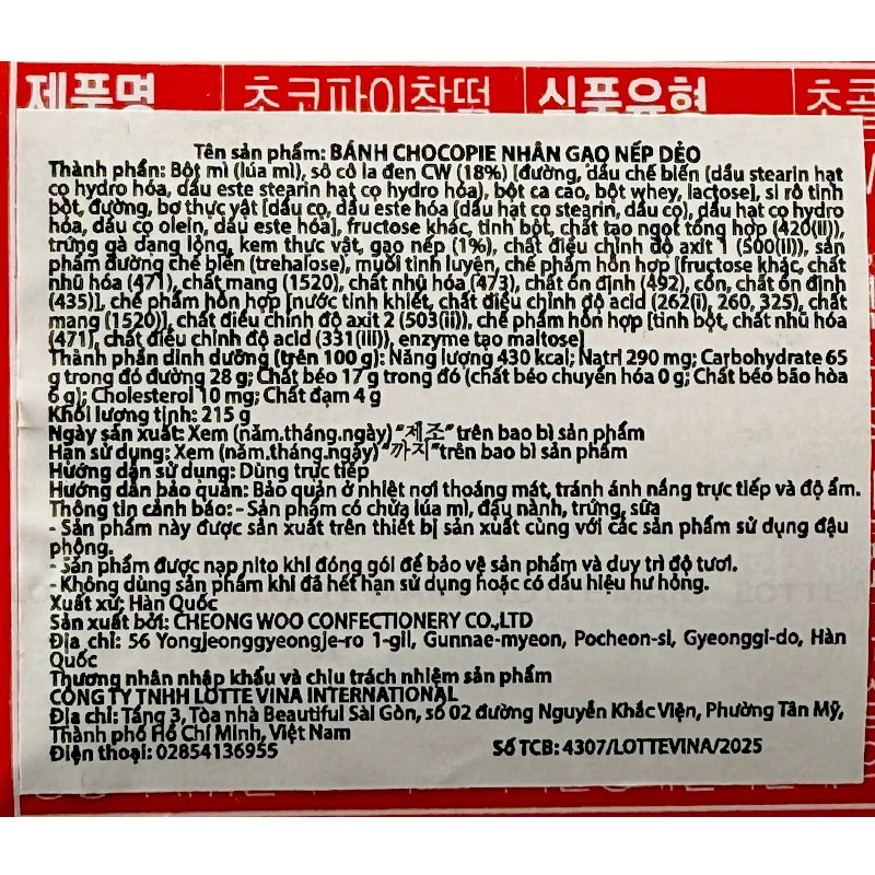 - Bột mì (lúa mì), sô cô la đen CW (18%) [đường, dầu chế biến (dầu stearin hạt cọ hydro hóa, dầu este stearin hạt cọ hydro hóa), bột ca cao, bột whey, lactose], si rô tinh bột, đường, bơ thực vật [dầu cọ, dầu este hóa (dầu hạt cọ stearin, dầu cọ), dầu hạt cọ hydro hóa, dầu cọ olein, dầu este hóa], fructose khác, tinh bột, chất tạo ngọt tổng hợp (420(ii)), trứng gà dạng lỏng, kem thực vật, gạo nếp (1%), chất điều chỉnh độ axit 1 (500(ii)), sản phẩm đường chế biến (trehalose), muối tinh luyện, chế phẩm hỗn hợp [fructose khác, chất nhũ hóa (471), chất mang (1520), chất nhũ hóa (473), chất ổn định (492), cồn, chất ổn định (435)], chế phẩm hỗn hợp [nước tinh khiết, chất điều chỉnh độ acid (262(i), 260, 325), chất mang (1520)], chất điều chỉnh độ axit 2 (503(ii)), chế phẩm hỗn hợp [tinh bột, chất nhũ hóa (471), chất điều chỉnh độ acid (331(iii)), enzyme tạo maltose]