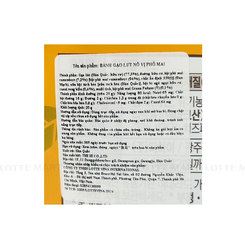 Thành phần: [bột phô mai camembert (94%), chất ổn định 339(i)] (Đan Mạch), sữa bột tách béo [sữa tách béo (Hàn Quốc)], bột bí ngô ngọt hữu cơ, canxi rong biển (0.4%), muối tinh, bột phô mai Grana Padano (Ý) (0.1%).
