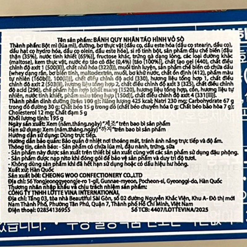 Bánh Quy CW Hình Vỏ Sò Nhân Táo là sản phẩm thuộc thương hiệu bánh kẹo nổi tiếng CW của Hàn Quốc với chất lượng và hương vị được ưa chuộng tại thị trường này.