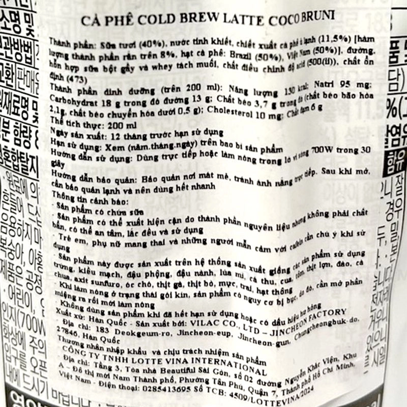 - Sữa tươi (40%), Nước tinh khiết, chiết xuất cà phê ủ lạnh, hạt cà phê: Brazil (50%), Việt Nam (50%), đường, hỗn hợp sữa bột gầy và whey tách muối,...