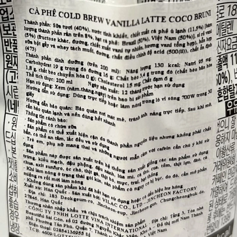 Thành phần: Sữa tươi, nước tinh khiết, chiết xuất cà phê ủ lạnh (11.5%), hạt cà phê: Brazil (50%), Việt Nam (50%), xi-rô vani, đường, hỗn hợp sữa bột gầy và whey tách muối,...