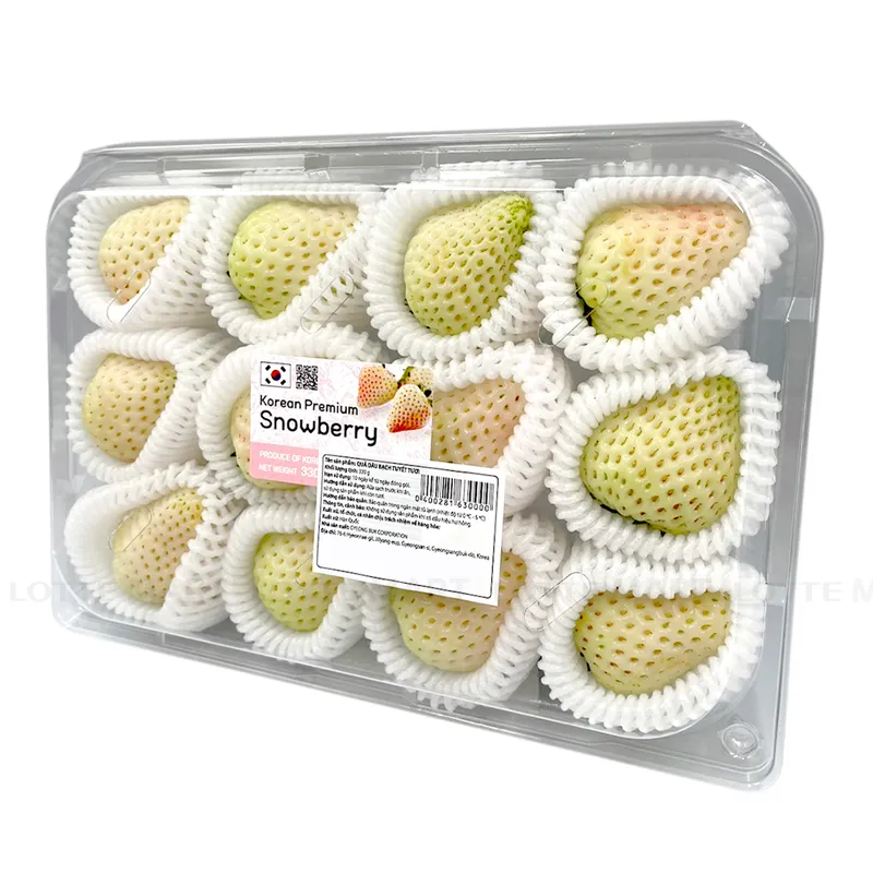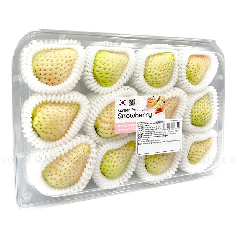 Dâu Bạch Tuyết Hàn Quốc giống với dâu tây đỏ nhưng to hơn, khi chín chuyển từ màu xanh sang trắng và các mắt có màu đỏ sậm đẹp mắt, vỏ mỏng.