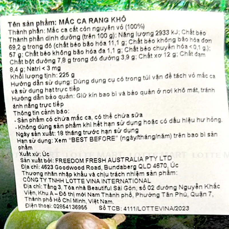 Bạn sẽ nhận thấy gói hàng giả có dòng chữ ‘Macadamias Australia’ màu vàng bóng.