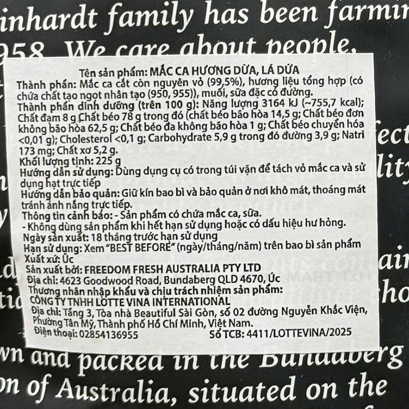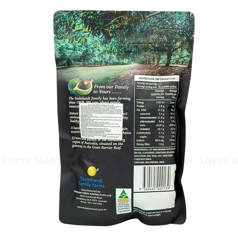 - Hạt macca Happy Nut Freedom Fresh Australia được trồng ngay tại vùng Bundaberg, cung cấp cho khách hàng những sản phẩm tươi ngon.