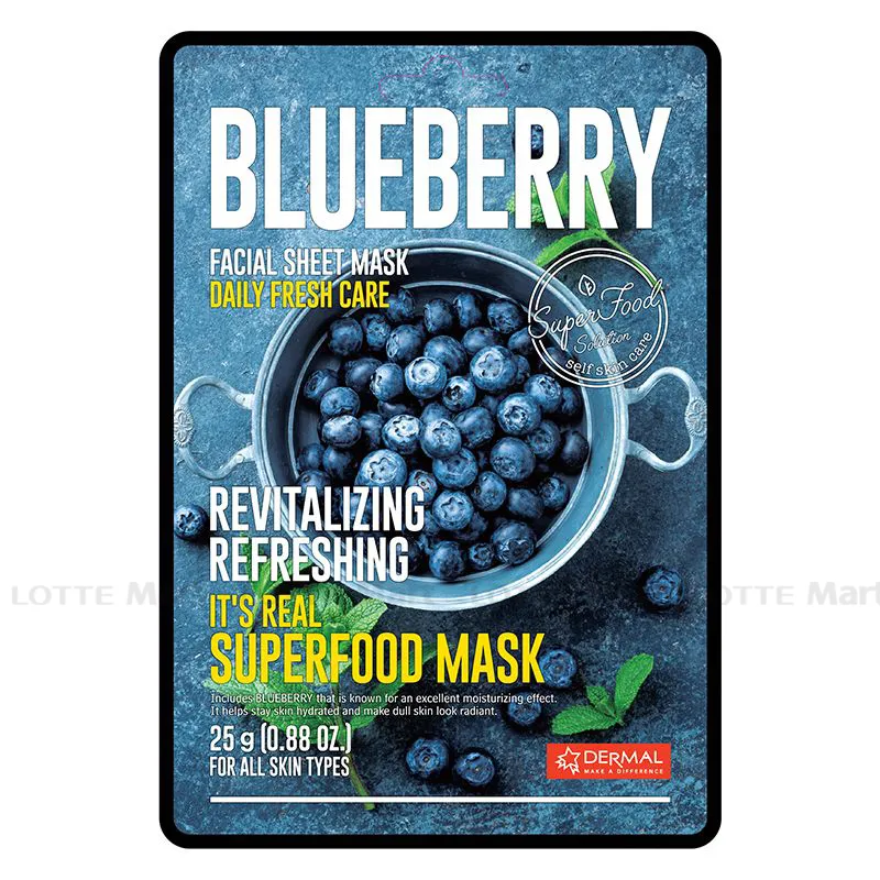 - Superfoods - Siêu thực phẩm từ xưa đến nay đã được quan tâm và đánh giá cao khi sử dụng làm thực phẩm, chế biến món ăn vì nó chứa nhiều chất dinh dưỡng tốt. Chính vì điều đó nên Dermah đã chọn lọc và sử dụng các loại siêu thực phẩm nổi bật vào phương thức dưỡng da bằng Mặt Nạ Giấy Dermal It's Real Super Food Mask Việt Quất 25G , cung cấp dưỡng chất cho da, bổ sung vitamin từ trái cây, thực phẩm cho bạn một làn da tươi sáng và khỏe mạnh.