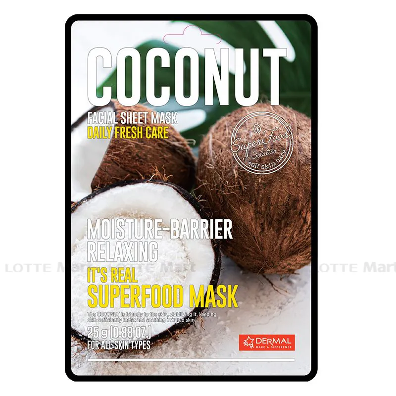 Superfoods - Siêu thực phẩm từ xưa đến nay đã được quan tâm và đánh giá cao khi sử dụng làm thực phẩm, chế biến món ăn vì nó chứa nhiều chất dinh dưỡng tốt. Chính vì điều đó nên Dermah đã chọn lọc và sử dụng các loại siêu thực phẩm nổi bật vào phương thức dưỡng da bằng Mặt Nạ Giấy Dermal It's Real Super Food Mask Quả Dừa 25G, giúp da thư giãn, cung cấp dưỡng chất cho da, bổ sung vitamin từ trái cây, thực phẩm cho bạn một làn da tươi sáng và khỏe mạnh. Công dụng: Mặt Nạ Giấy Dermal It's Real Super Food Mask Quả Dừa 25G chiết xuất từ trái dừa cân bằng độ ẩm, làm dịu làn da đang bị kích ứng. Chất liệu mặt nạ sợi tencel giúp da dễ hấp thu dưỡng chất. mặt nạ ôm khít mặt. Thành phần: Water, Glycerin, Propanediol, Ethanol, 1,2-Hexanediol, Panthenol, Betaine. Sodium Hyaluronate, Tromethamine, Cetearyl Olivate, Sorbitan Olivate, Acrylates/C10-30 Alkyl Acrylate Crosspolymer, Biosaccharide Gum-1, Carbomer, Ethylhexylglycerin, Butylene Glycol, Vaccinium Angustifolium (Blueberry) Fruit Extract (1000 ppm). Fragrance (Perfume)… Hướng dẫn sử dụng: Sau khi rửa mặt và sử dụng nước hoa hồng, lấy mặt nạ ra khỏi túi và đặt miếng mặt nạ lên sao cho vừa khít với khuôn mặt. Sau 15 đến 20 phút thì gỡ bỏ lớp mặt nạ, sau đó vỗ nhẹ để lượng Essence còn lưu trên da có thể thấm sâu vào da hơn, 1 tuần sử dụng trên 2 lần sẽ giúp phục hồi làn da. Tránh xa tầm tay trẻ em. Không sử dụng với da đang bị sưng tấy, ngứa rát hoặc bị bỏng nắng. Hạn sử dụng: 3 năm kể từ ngày sản xuất. Xuất Xứ: Hàn Quốc.
