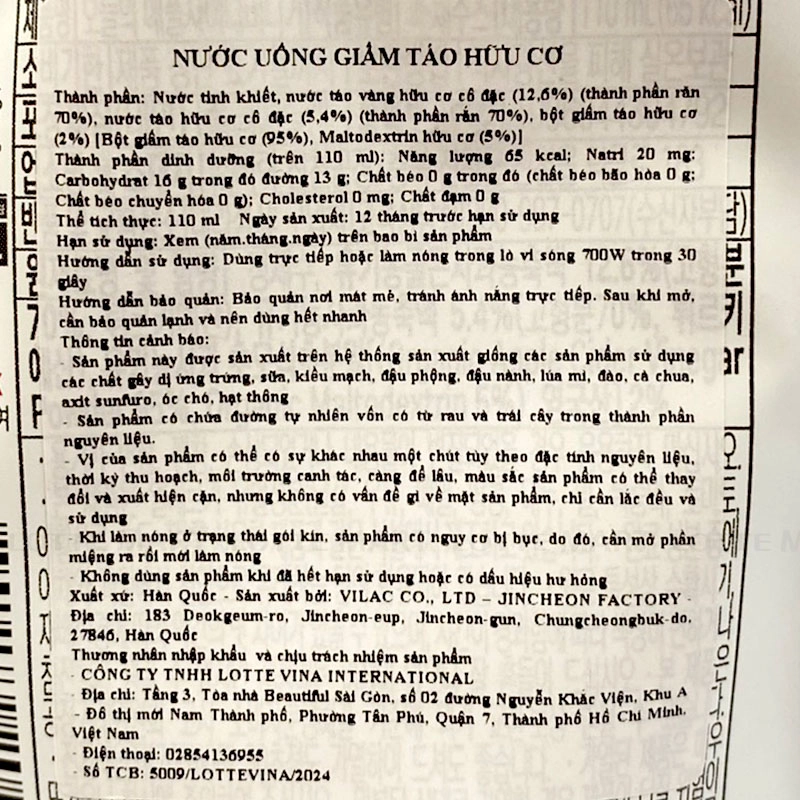 Nước Giấm Uống Hữu Cơ Vilac Vị Táo sử dụng bột giấm táo hữu cơ chất lượng có nguồn gốc từ Anh.
