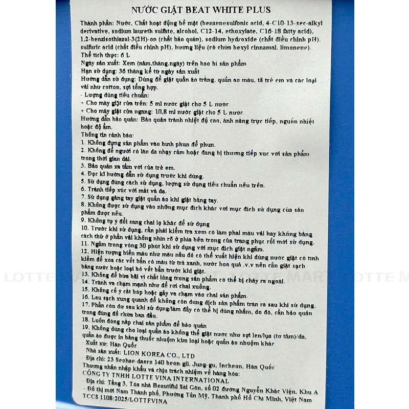 Nước Giặt Beat White Plus Cho Máy Giặt Cửa Trước Và Cửa Trên 6L