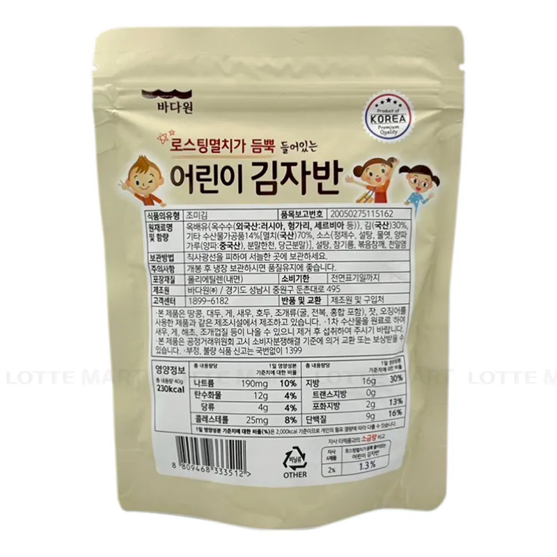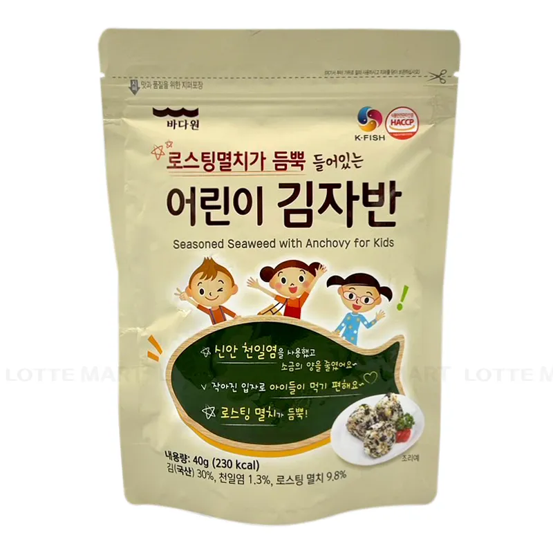 - Rong Biển Trẻ Em Badaone Vị Cá Cơm Gói 40G là sản phẩm nhập khẩu từ Hàn Quốc, được làm từ nguồn nguyên liệu sạch, qua quá trình sấy khô không chiên vì thế sản phẩm sẽ có lượng calo thấp và giúp bé làm quen với nhiều loại hương vị trong giai đoạn tập ăn một cách an toàn.