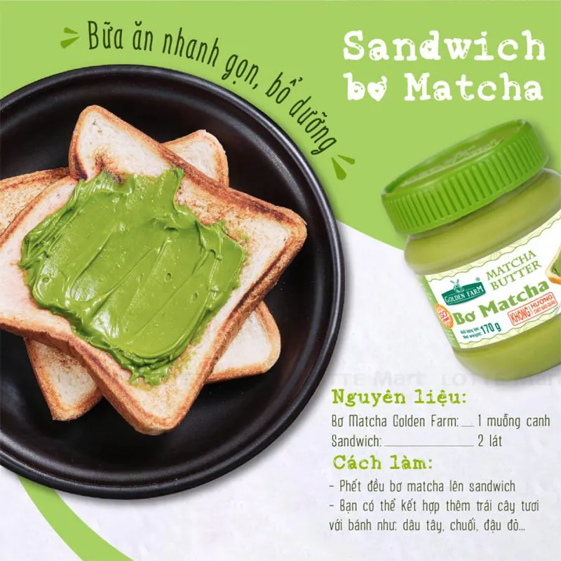 - Với thành phần bột matcha thượng hạng, không đường hóa học, Bơ Matcha Golden Farm là lựa chọn hoàn hảo để bạn đổi vị cho các món ăn quen thuộc của cả gia đình.