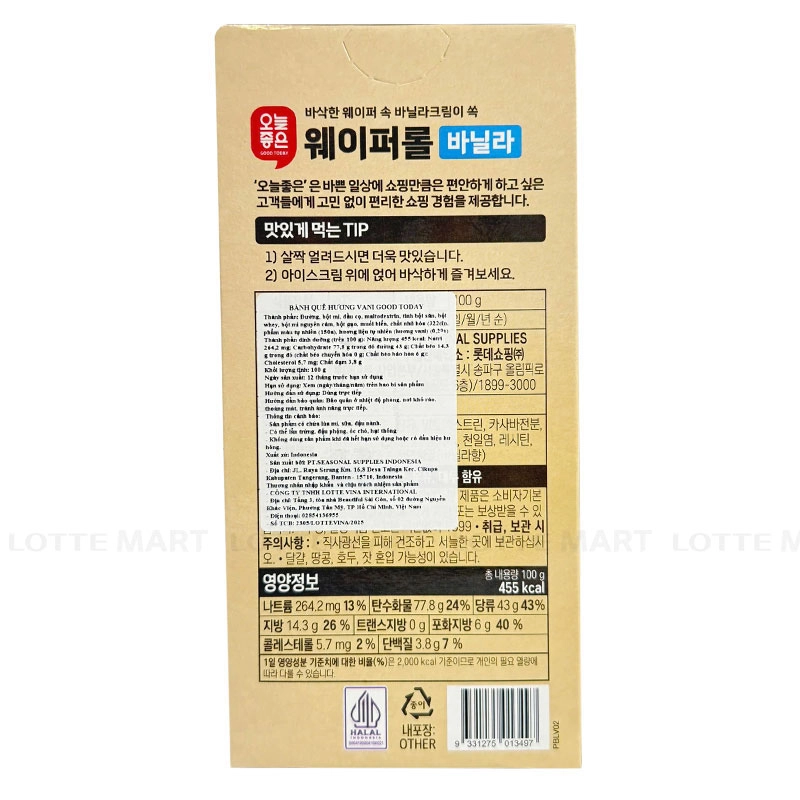 Bánh Quế Good Today Vị Vani nhập khẩu Indonesia với lớp vỏ bánh quế được nướng vàng ươm, giòn tan bao bọc lấy lớp nhân kem vani mềm mịn, mang đến cảm giác thích thú trong từng miếng cắn.