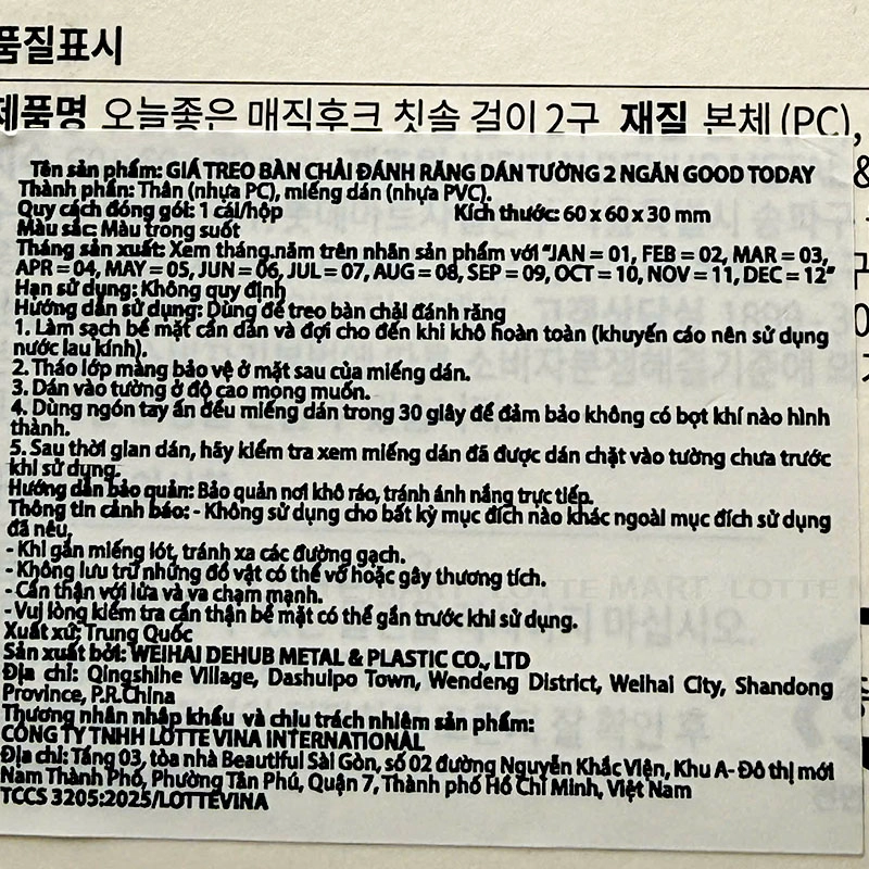 Hướng dẫn sử dụng: Dùng để treo bàn chải đánh răng.