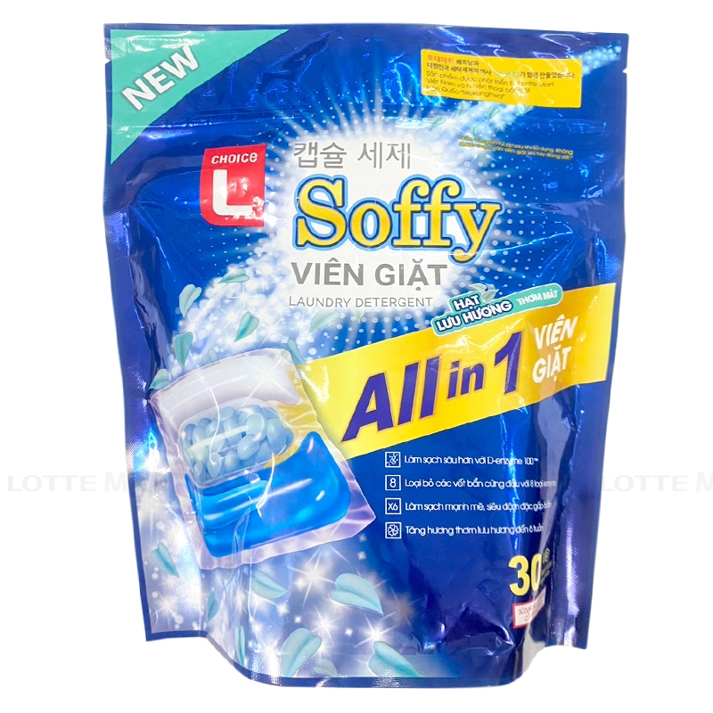 - Viên Giặt Soffy All In 1 Hạt Lưu Hương Thơm Mát Túi 30 Viên 14g là loại viên giặt thế hệ mới dành cho máy giặt cửa trước và cửa trên, giúp làm sạch nhanh chóng, hiệu quả cùng hạt lươi hương thơm mát giúp áo quần sạch sẽ, thơm tho suốt ngày dài.