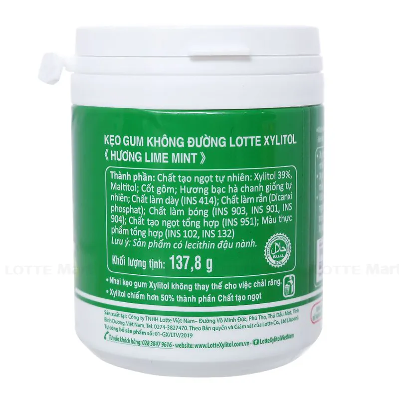 Thành phần: Chất tạo ngọt: Xylitol, Maltitol Aspartam, cốt gôm, hương bạc hà chanh giống tự nhiên và tổng hợp, chất làm dày(414),...