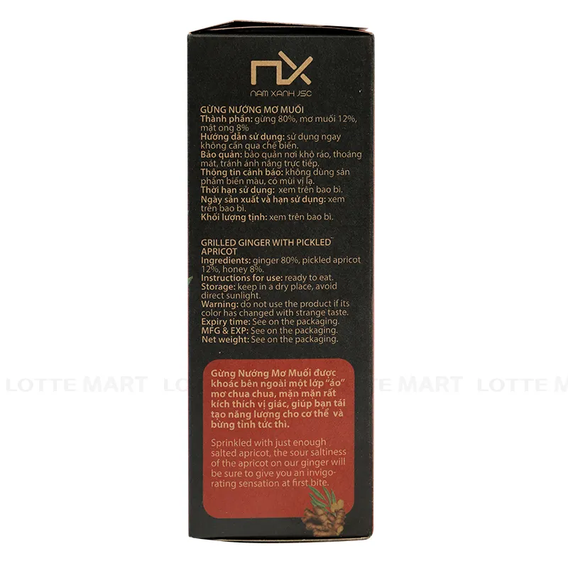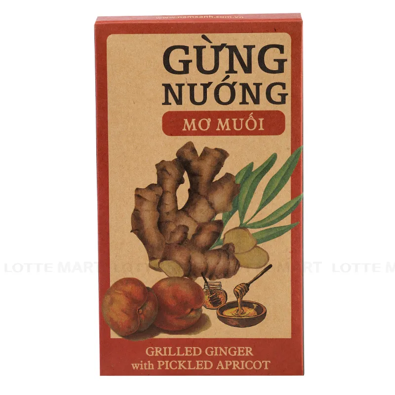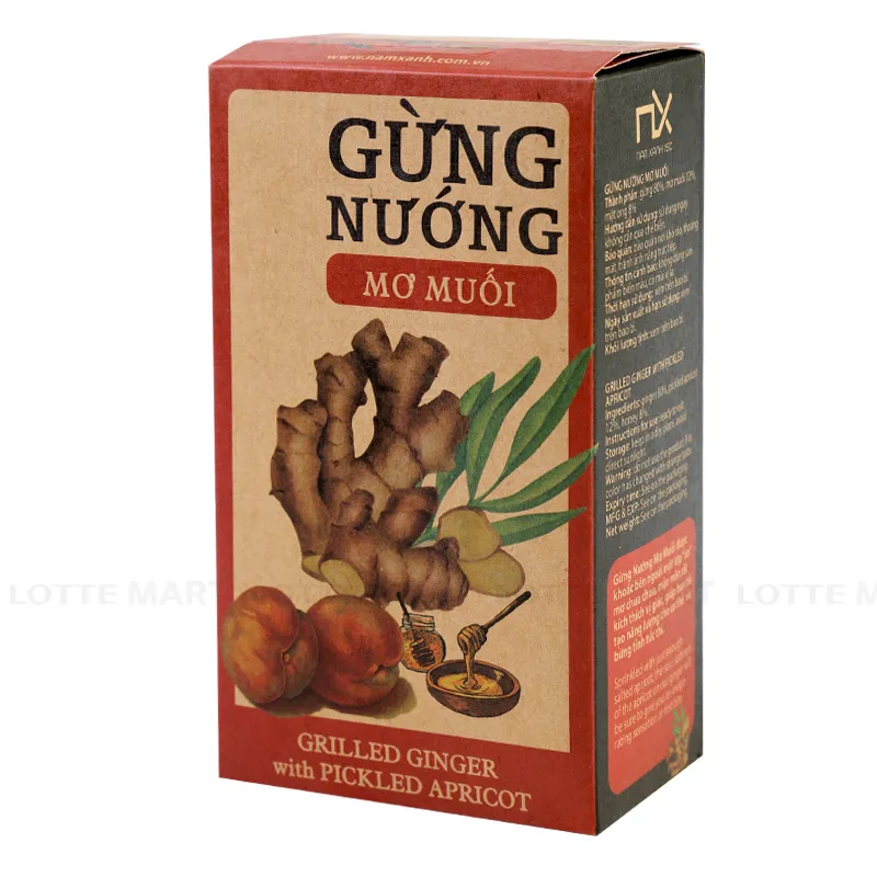 - Gừng Nướng Mơ Muối Nam Xanh Hộp 80G đã dần quen thuộc hơn với mọi người. Thay vì kết hợp với đường truyền thống, sản phẩm được chế biến bằng công thức đặc biệt hơn đó là phủ mật ong lên miếng gừng và nướng cho đến khi mùi thơm của gừng và mật ong hòa quyện vào nhau, tạo nên những lát gừng mỏng nhưng hương vị đậm đà, không giống bất cứ món gừng nào từng có. Với phiên bản Gừng Nướng Mơ Muối mới là sự kết hợp độc đáo giữa gừng nướng mật ong và mơ muối truyền thống.