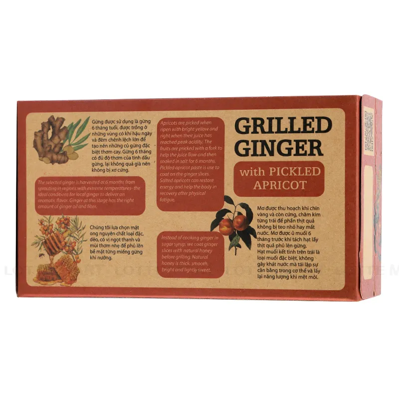 - Gừng Nướng Mơ Muối được phủ bên ngoài một lớp mơ chua chua, mặn mặn rất kích thích vị giác, giúp bạn tái tạo năng lượng cho cơ thể và bừng tỉnh tức thì. Sản phẩm được đóng hộp nhỏ gọn, tiện lợi để mang theo trong những chuyến đi, hoạt động ngoài trời hoặc dùng làm quà tặng cho người thân, bạn bè.