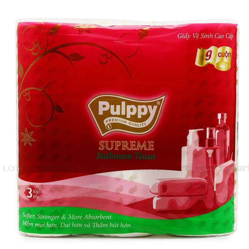 Giấy vệ sinh 3 lớp Pulppy Supreme bịch 9 cuộn là sản phẩm giấy vệ sinh chất lượng cao được sản xuất trên dây chuyền khép kín với công nghệ mới đảm bảo an toàn vệ sinh.