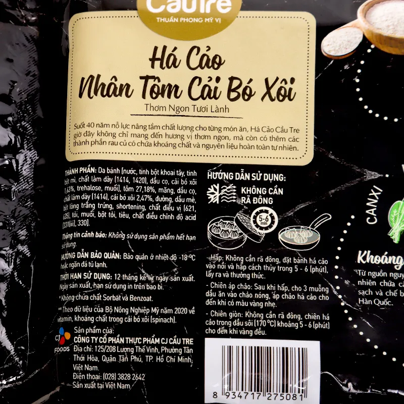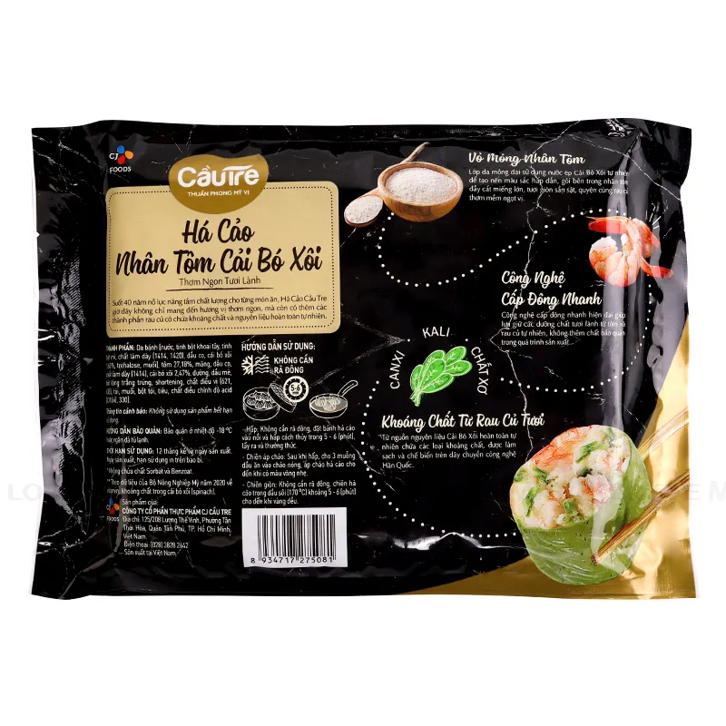 Thành phần: Bột há cảo, thịt heo, củ sắn, cá, tôm, bột, cà rốt, đường, chất điều vị E621, hành tím, muối, dầu mè, tỏi, tiêu, cải bó xôi...