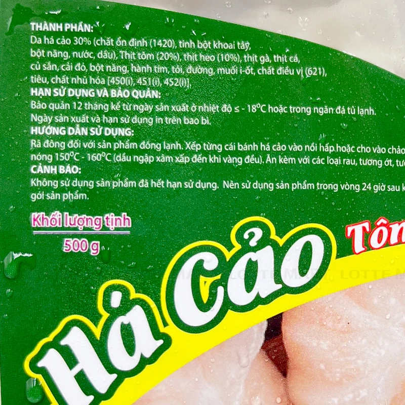 Thành phần: Thịt heo, cá thác lác, tôm, cá basa, bột há cảo, củ sắn, cà rốt, củ hành, muối, tiêu, tỏi, dầu mè, hạt nêm, phụ gia thực phẩm, chất hỗ trợ chế biến: tinh bột biến tính, chất điều vị, chất nhũ hóa, màu tổng hợp.