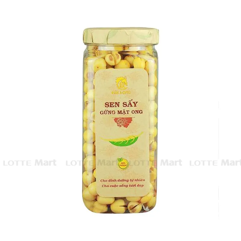 Sen Sấy Gừng Mật Ong Hải Long với thành phần hạt sen nguyên chất, được bóc tách vỏ cẩn thận nhưng vẫn đảm bảo độ giòn, ngọt pha chút bùi bùi rất riêng của loại hạt giàu dinh dưỡng này. Ngoài ra, còn có sự kết hợp với gừng và mật ong làm tăng thêm hương vị cho món ăn.