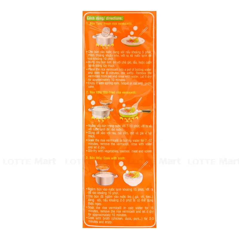 • Cho bún vào nước đang sôi khoảng 5 phút, thỉnh thoảng khuấy nhẹ, vớt ra xả ráo khoảng 10 phút. Dùng như bún tươi, ăn với chả giò, lẩu hoặc cuốn bánh tráng.