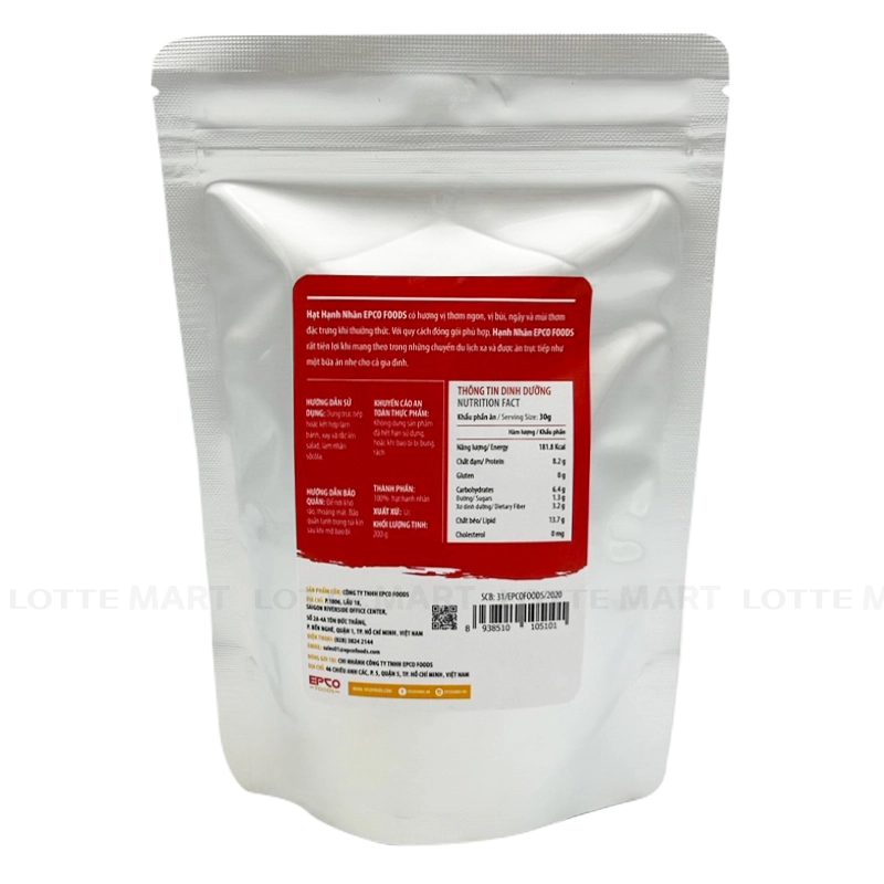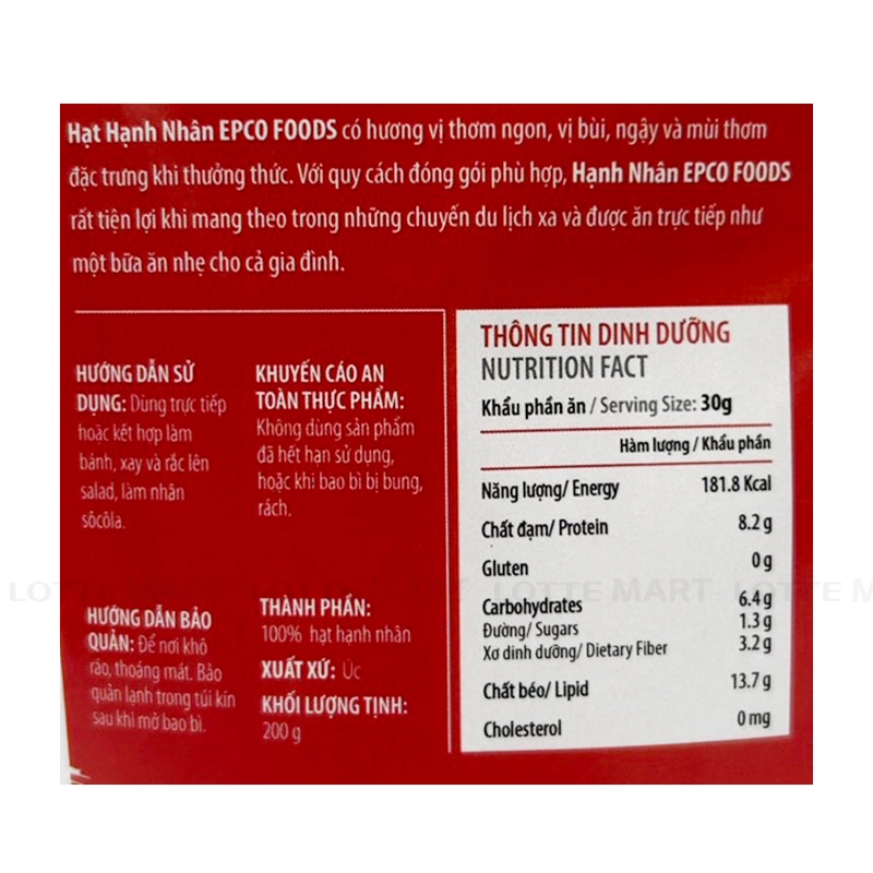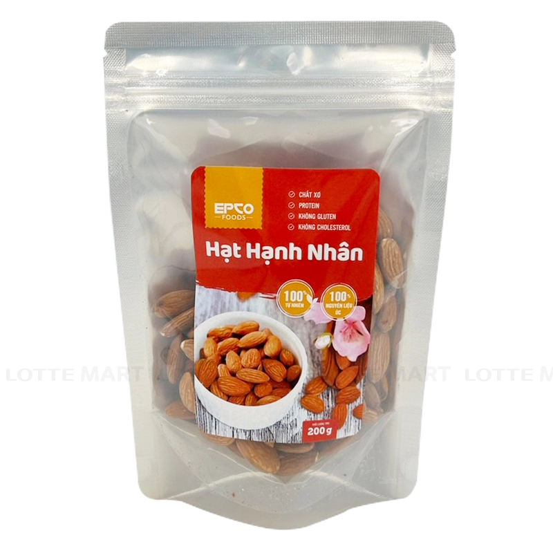 - Hạt Hạnh Nhân Epco Foods 200g được tuyển chọn kỹ lưỡng từ những hạt hạnh nhân đều mẩy, chắc và hương vị tự nhiên hấp dẫn, bổ sung vitamin E, không cholesterol và tranfat nên rất được ưa chuộng.