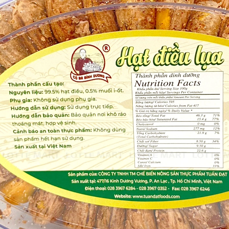 Hạt Điều Lụa Tuấn Đạt được làm từ những nguyên liệu tự nhiên và qua nhiều khâu chọn lọc kỹ lưỡng, mang đến chất lượng và mùi vị tuyệt hảo. Hương thơm lừng hòa quyện cùng béo của hạt điều đến sự thích thú và không gây ngán cho bạn khi thưởng thức.