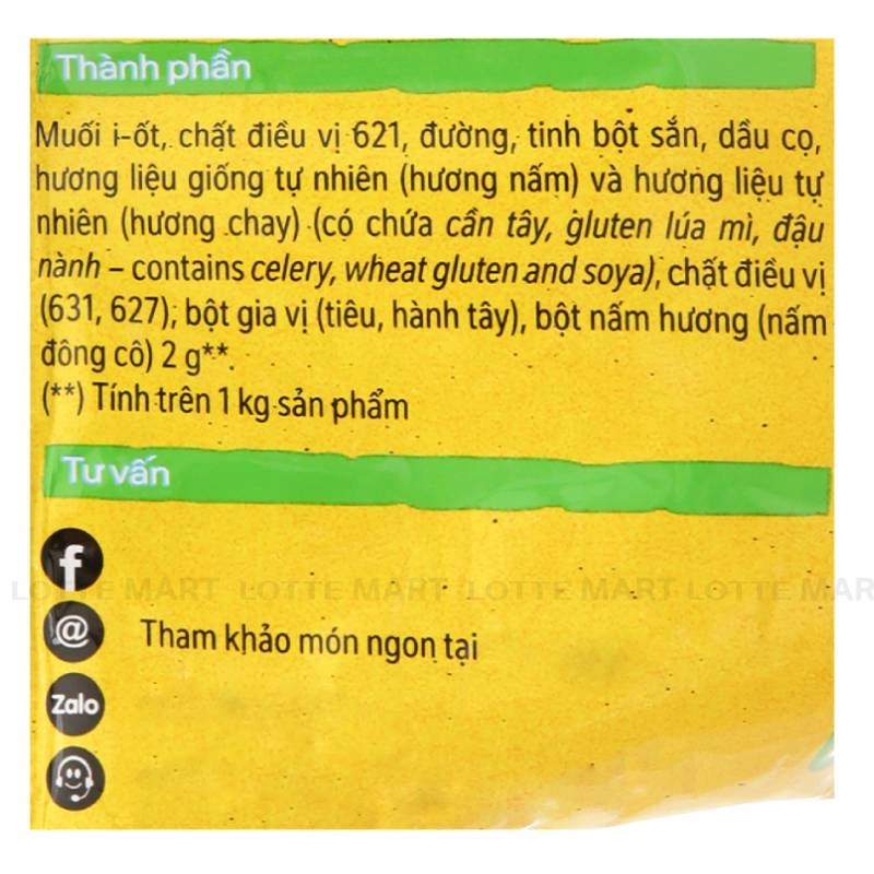 - Muối iot, chất điều vị 621, đường, tinh bột sắn, dầu cọ, hương liệu giống tự nhiên (hương nấm) và hương liệu tự nhiên ( hương chay) ( có chứa cần tây, gluten, lúc mì, đậu nành), bột gia vị, tiêu, hành tây, bột nấm hương.