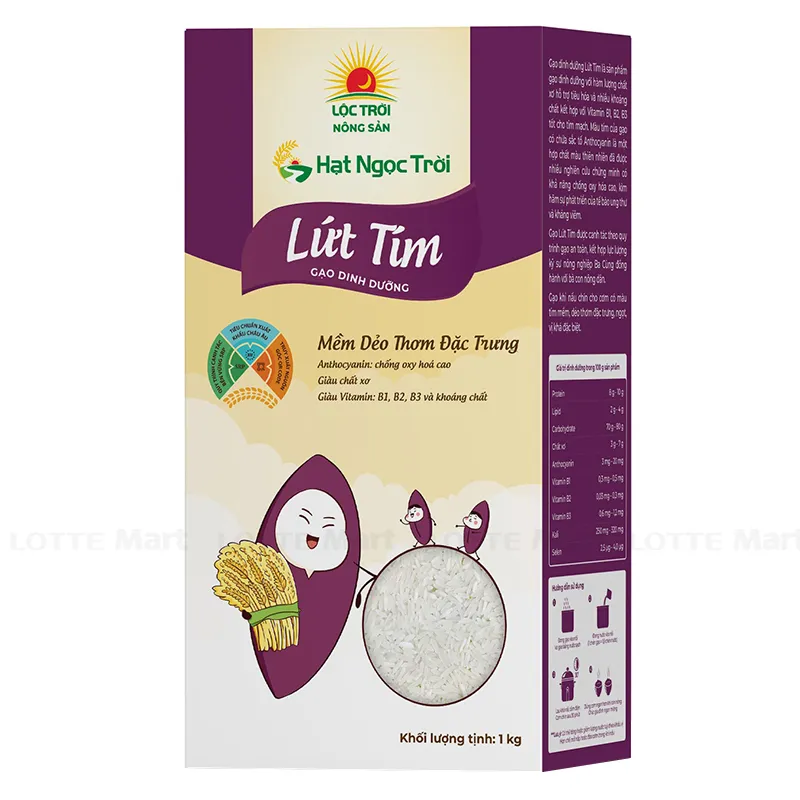 - Gạo Lứt tím Hạt Ngọc Trời hộp 1kg là sản phẩm gạo dinh dưỡng với hàm lượng chất xơ hỗ trợ tiêu hóa và nhiều khoáng chất kết hợp với Vitamin B1, B2, B3 tốt cho tim mạch. Màu tím của gạo có chứa sắc tố Anthocyanin là một hợp chất màu thiên nhiên đã được nhiều nghiên cứu chứng minh có khả năng chống oxy hóa cao, kìm hãm sự phát triển của tế bào ung thư và kháng viêm.