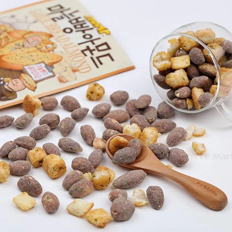 - Hạt hạnh nhân (50.205%), hỗn hợp bánh mì nướng [Bánh mì (bột mì), bơ thực vật, đường, bột tỏi (0.1%), phẩm màu tổng hợp (INS 101(i)] (19.479%), đường (13.261%), xi-rô tinh bột (7.358%), gia vị bánh mì tỏi tự nhiên [chất tăng cường hương vị tỏi, muối chế biến, bột kem bơ, bột tỏi nướng (0.441%)] (5.279%), đường chế biến (1.935%), dầu bắp (0.983%), dầu đậu nành (0.675%), mật ong (0.663%), bột mùi tây (0.145%), chất chống oxy hóa (INS 322(i)) (0.015%), chiết xuất thảo mộc (0.002%).