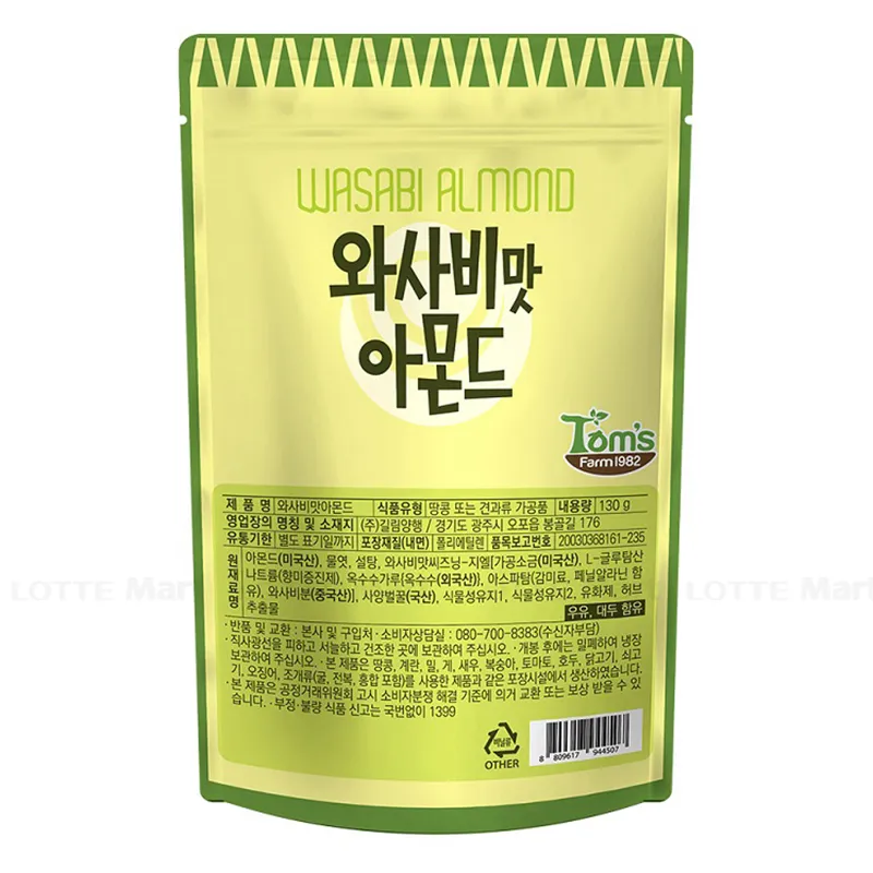 Hạnh Nhân HBAF Vị Wasabi gồm những hạt hạnh nhân được tẩm wasabi lạ miệng, thơm thơm hấp dẫn. Hạt hạnh nhân tẩm wasabi Tom's Farm gói 210g khi ăn có vị béo béo của hạnh nhân cũng như chút the the của wasabi, kích thích vị giác. Hạt hạnh nhân Tom's Farm được sản xuất tại Hàn Quốc, phù hợp cho ăn vặt, thưởng trà...